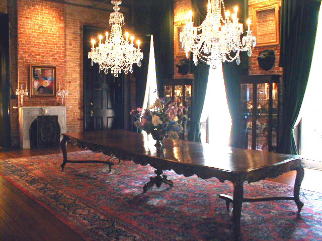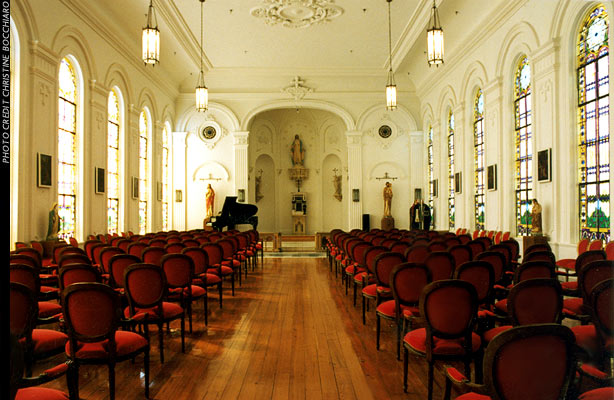 Huge drawing rooms -- the game room with its leather furnishings and reproduction juke box, and pool table -- the green ballroom with its many mirrors and majestic velvet draperies -- and the dining room with its bold antique table and sideboard -- lead to the upstairs and the magnificent two-story chapel, with fully restored plaster ceilings and walls, and the original stained glass windows. The chapel seats 225 for recitals or concerts or what you will. Acoustics are incredible. And the chairs can be cleared away to reveal a wonderful wooden dance floor.