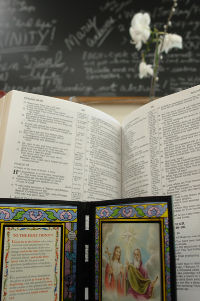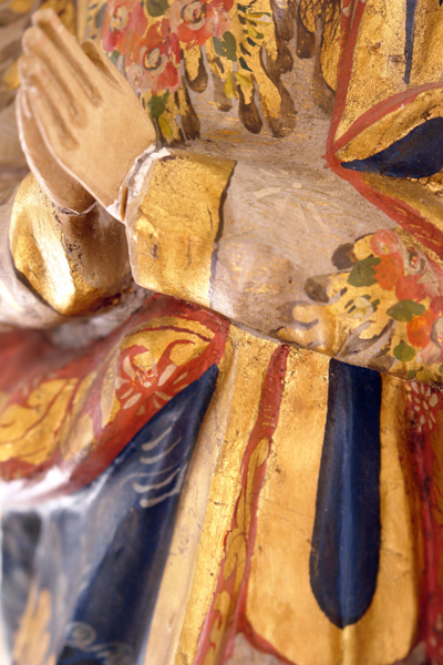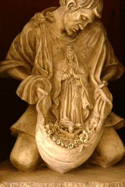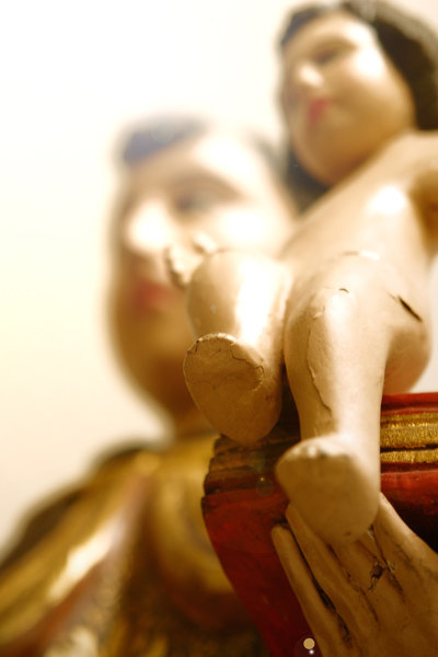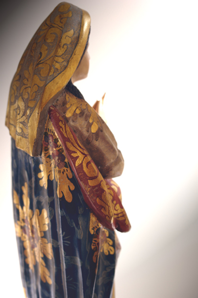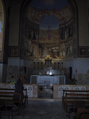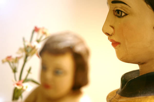 It was the white chapel at St. Elizabeth's that particularly captivated Anne. Its brilliant stained glass windows fill the church with subtly tinted light. The former altar and the side aisles remain adorned with Roman Catholic religious statues and figurines, part of Anne's extensive collection. To have a closer look, download the White Chapel QTVR movie (527K), which is a navigable, 3-D, 150 degree look from the center aisle.