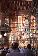 Scaffolding dominates the interior of the church, but Mass is still being said and parishoners pray.